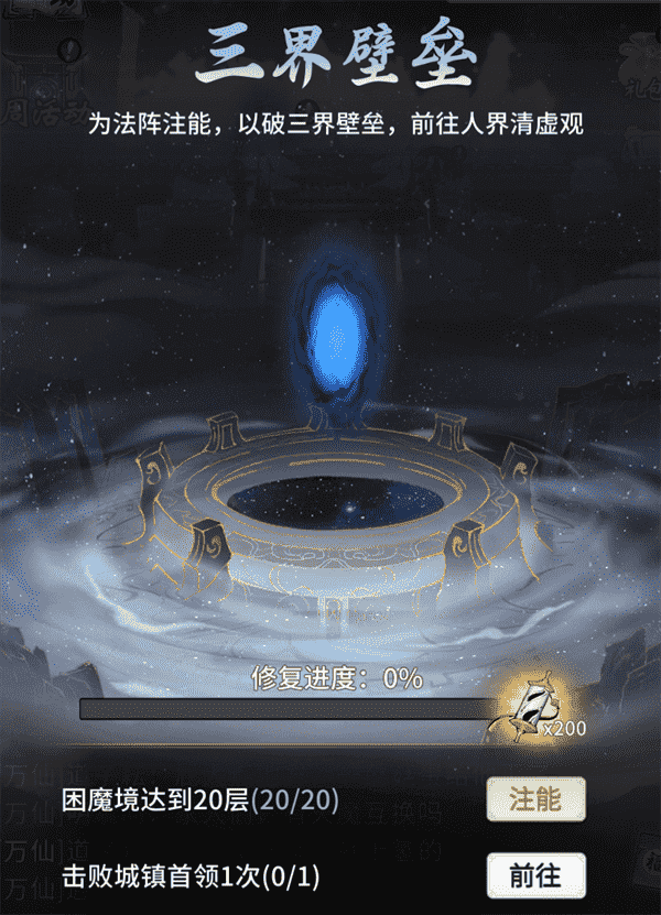 当你修为达到返虚/破虚中期后,,,可在城镇寻得芸丫并激活神秘法阵,,,通过收集材料、、击败首领等方式为法阵注能,,,借以打破三界壁垒,,开启支线剧情“清虚旧梦”