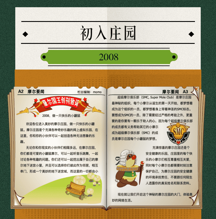 在这一年,,,,摩尔庄园诞生了。。。在这里,,,大家都是可爱的红鼻子鼹鼠小摩尔,,,,可以一起勤劳耕作,,一起高山滑雪......我们都是摩尔庄园的建设者。。