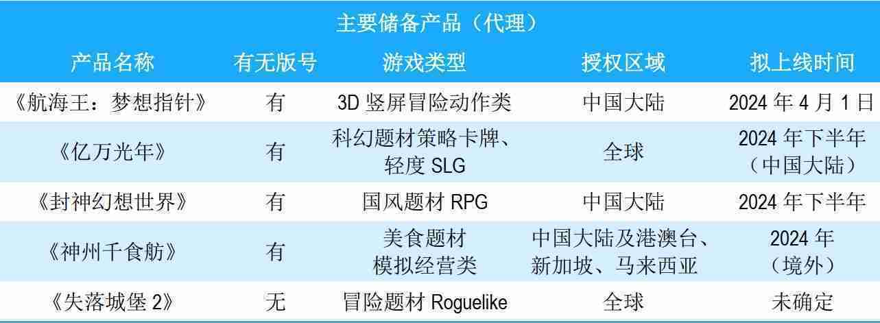 公司储备的多个自研、、、代理产品都在有序推进当中,,涵盖放置类、、、策略类、、、、模拟经营类、、、RPG、、、Roguelike等多元化游戏品类,,,储备的主要自研和代理产品如下:::