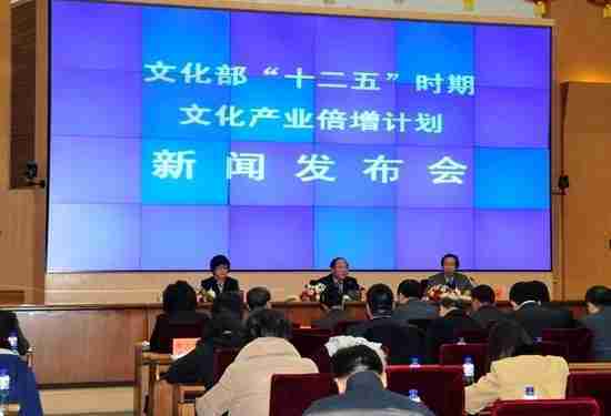 2月28日下午,,文化部在京召开新闻发布会,,,,正式向社会发布《文化部“十二五”时期文化产业倍增计划》,,,提出了 “十二五”期间文化部门管理的文化产业增加值年平均现价增长速度高于20%,,,2015年比2010年至少翻一番,,,,实现倍增的奋斗目标。。。。